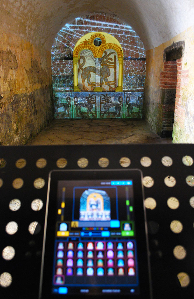 Interprétation et animation des motifs de carreaux dessinés par les moines Cisterciens au Moyen-Age. Changement des projections vidéo ouverte au public grâce à une interface de VJing sur Ipad.